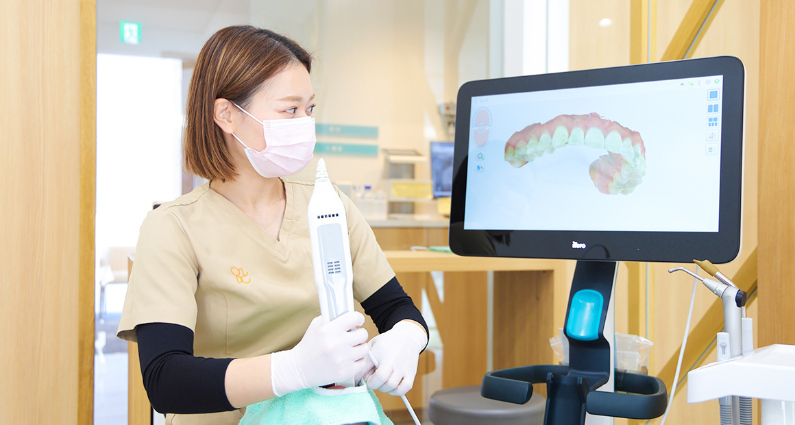 患者さんのお口の中を専用の小型カメラでスキャンし、1分程度で精密な歯型のデータを取得することができます。従来のような粘土状の印象材を使わないため、患者さんの負担が少ないのが特徴です。取得したデータはマウスピース矯正や被せ物・詰め物の製作に活用されています。