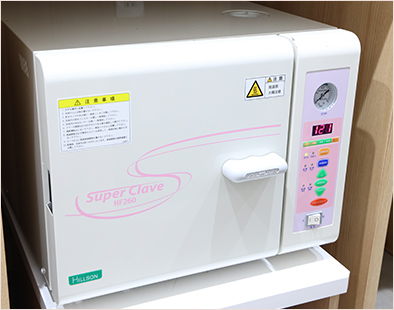 当院では、患者さんに安心して治療を受けていただくために、徹底した衛生管理を行っております。治療器具は高圧蒸気滅菌器やタービン用滅菌器で滅菌し、院内をクリーンに保つために口腔外バキュームや医療用空気清浄機を導入。厚生労働省に歯科外来診療感染対策加算の届け出も行い、清潔で安全な環境を整えています。